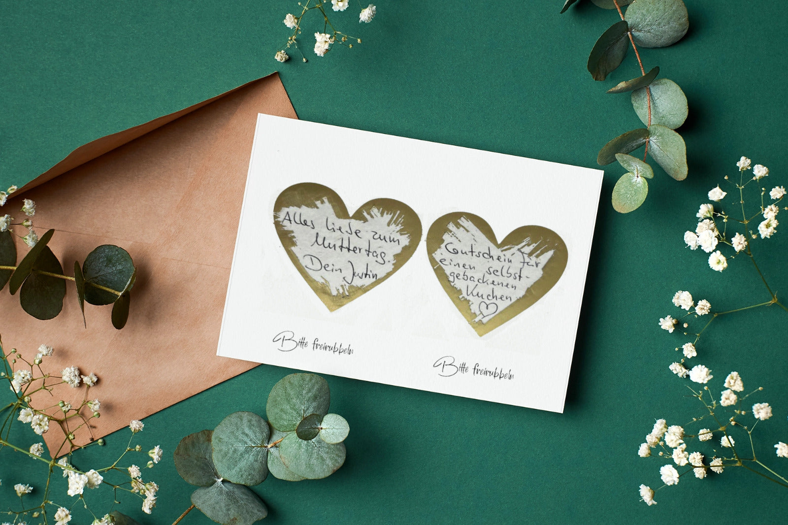 Herz-Rubbelkarte zum Muttertag + Umschlag (Weiß)