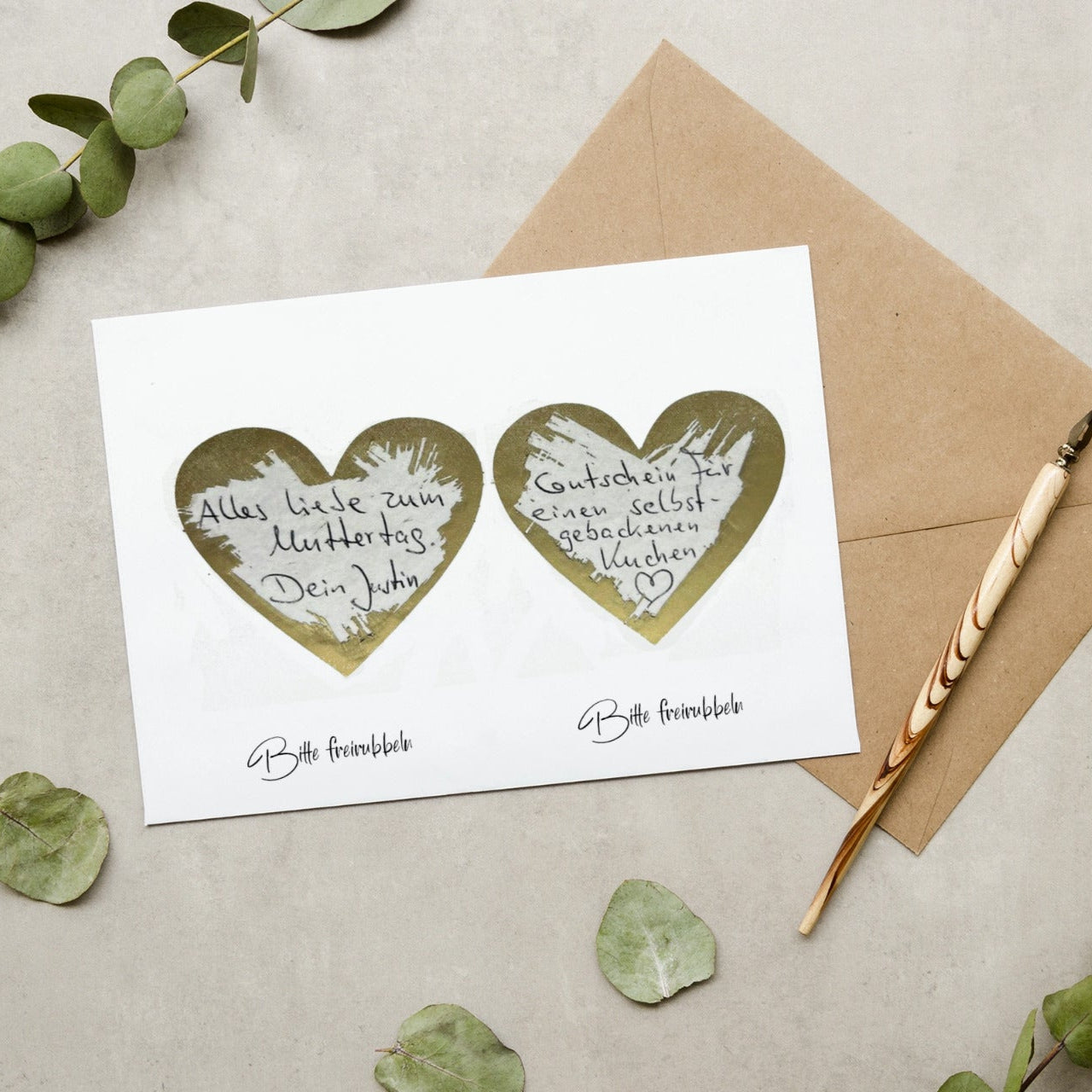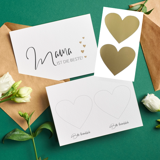 Diese liebevoll gestaltete Karte ist mehr als nur ein Muttertagsgruß: Du kannst zwei eigene Botschaften oder kleine Geschenke wie „Gutschein für einen selbstgebackenen Kuchen“ hineinschreiben – danach einfach die beiliegenden Rubbelsticker auf die Herzen kleben. Deine Mama rubbelt die Felder frei und entdeckt deine Überraschungen selbst – für einen unvergesslichen Wow-Effekt mit persönlicher Not